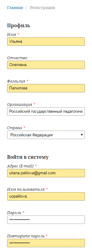На странице регистрации необходимо заполнить все поля в разделах «Профиль» и «Войти в систему».