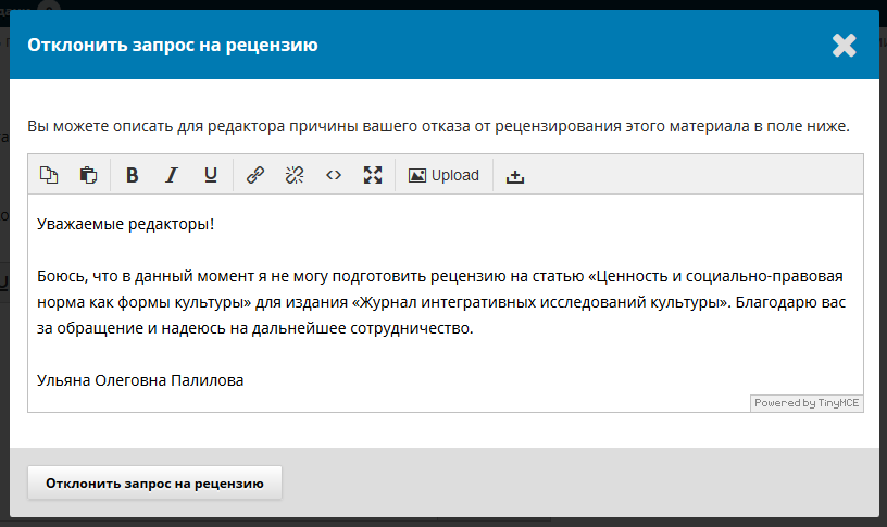 До истечения срока ответа вам нужно дать согласие на подготовку рецензии или отклонить запрос редакции. Вы можете отправить редактору стандартное сообщение или вписать свой текст письма.