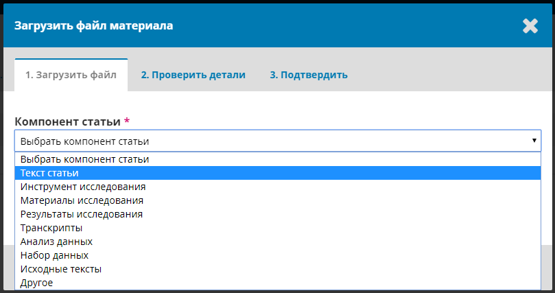 При загрузке файла в списке «Компонент статьи» нужно выбрать «Текст статьи». Пожалуйста, используйте для названия файла фамилию автора или первых двух соавторов в записи латиницей (например, «streltzov.docx»). После загрузки вы можете переименовать файл или загрузить вместо него другой.