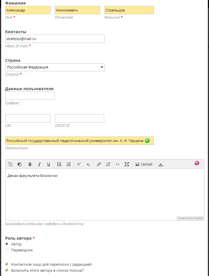 Для каждого соавтора нужно указать имя, отчество и фамилию, e-mail, страну и организацию. Внизу необходимо выбрать роль «Автор».